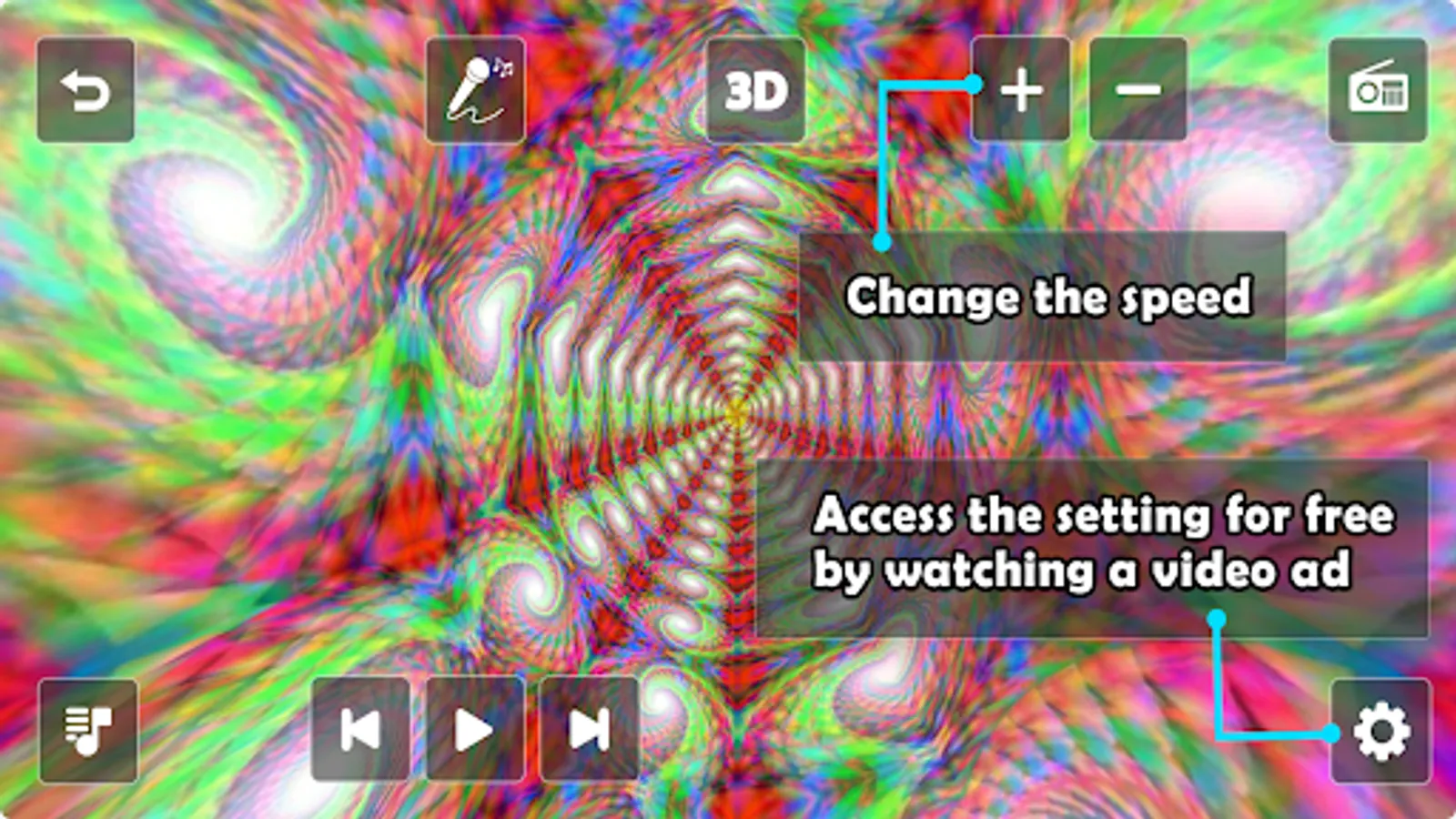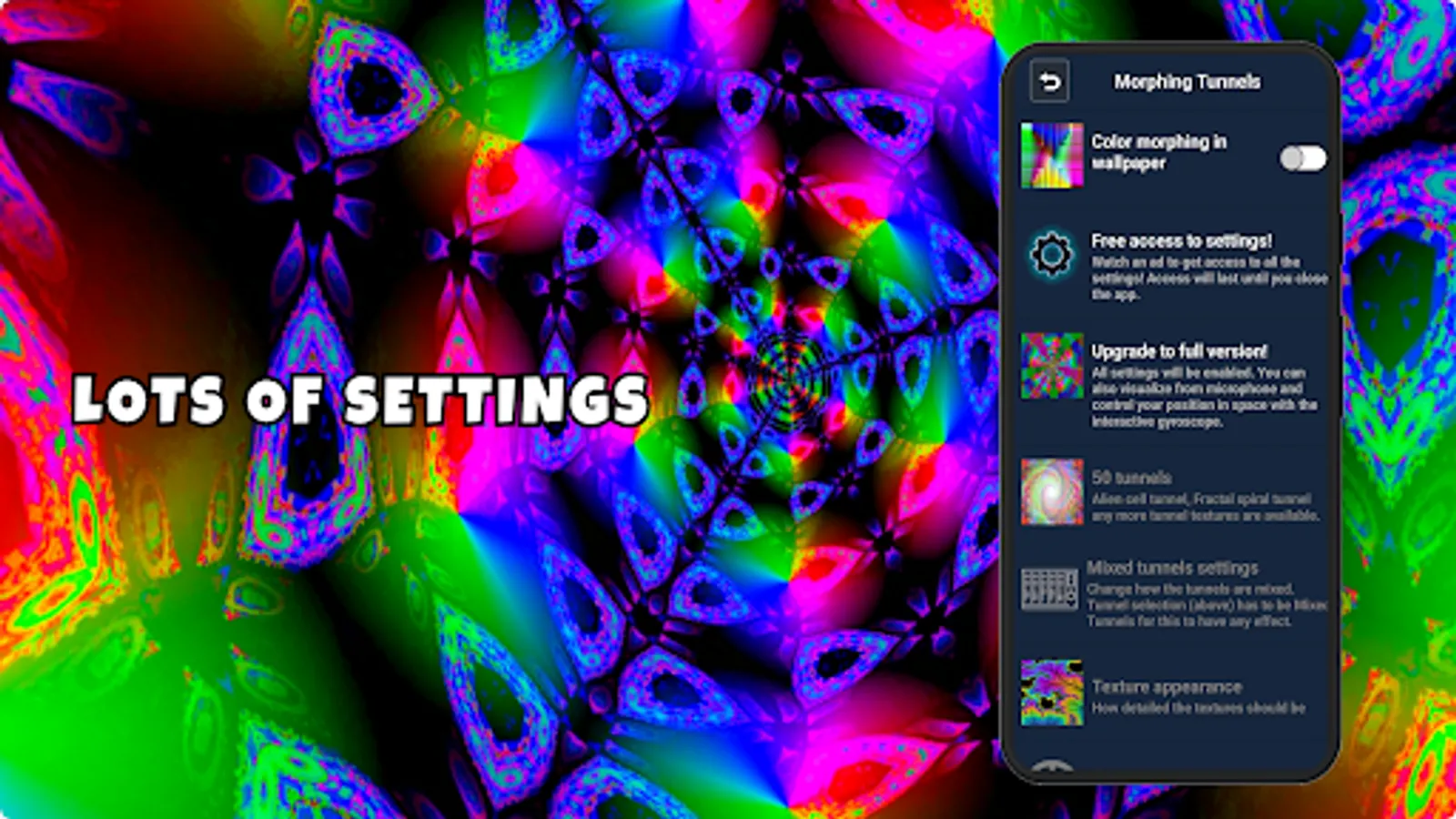 Fractal spiral tunnel, Alien cell tunnel and many more tunnel textures are available from the settings menu. Get temporary access to all the settings by watching a video ad. The access will last until you close down the app.