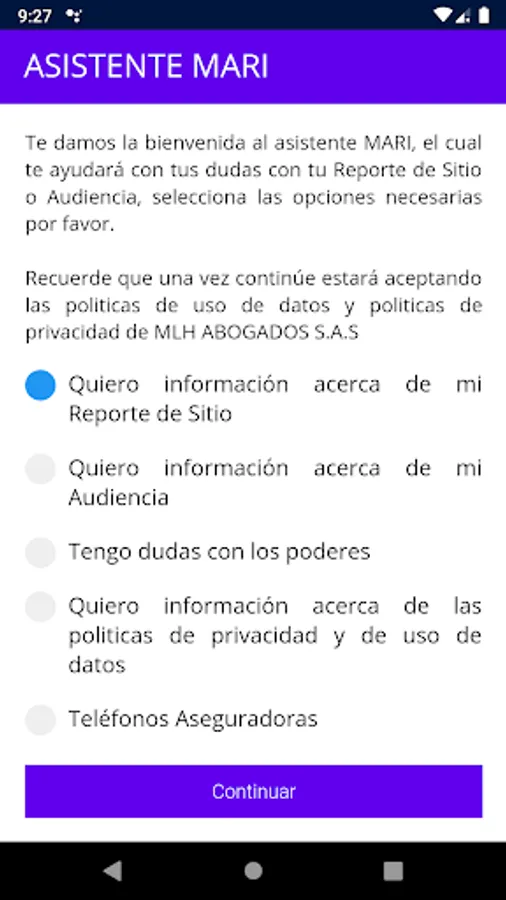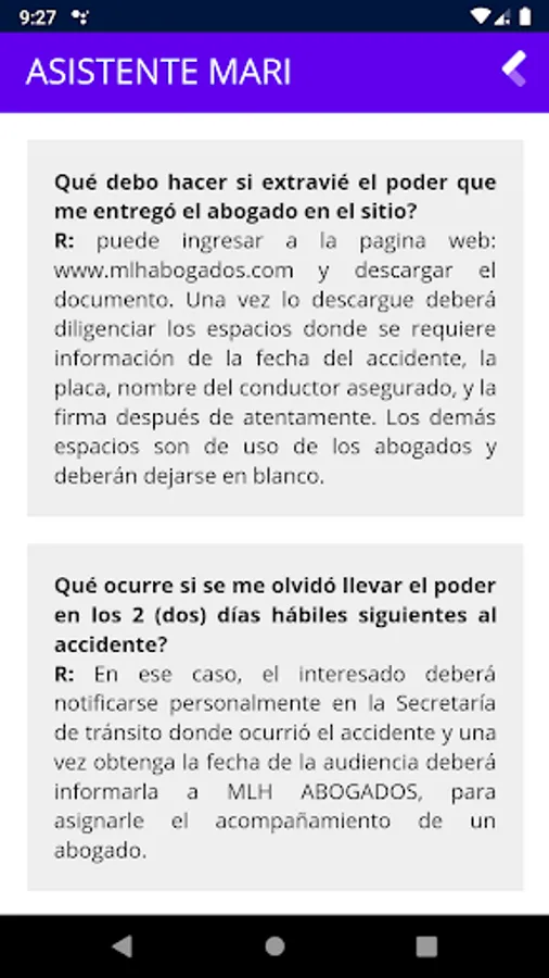 We present the APP with which you can answer any questions in your hearings or claims sites, which are attended by the law firm of MLH ABOGADOS SAS, you can see photos, useful information, time, date and place of hearings, documentation, etc.