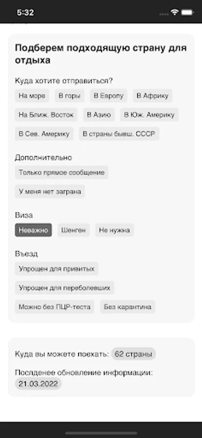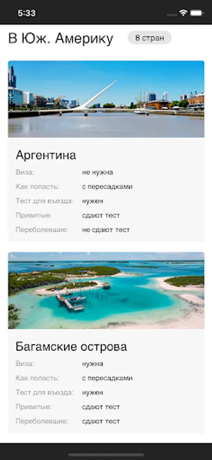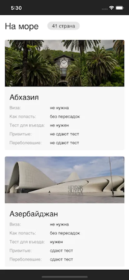 Now on the list are the most popular destinations among tourists, which can be reached relatively easily. We have not yet included states like Zimbabwe in the navigator, but in the future we plan to add all open countries. Stay tuned for updates and don't miss important information.