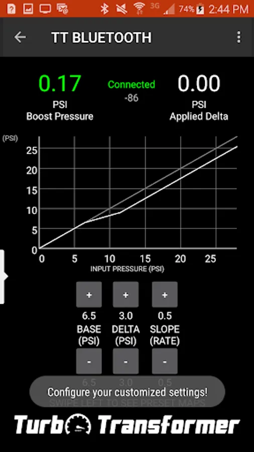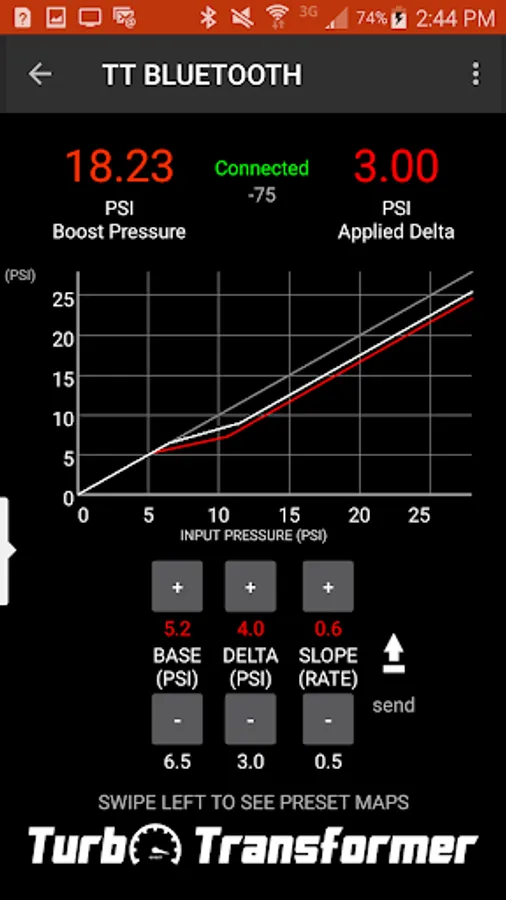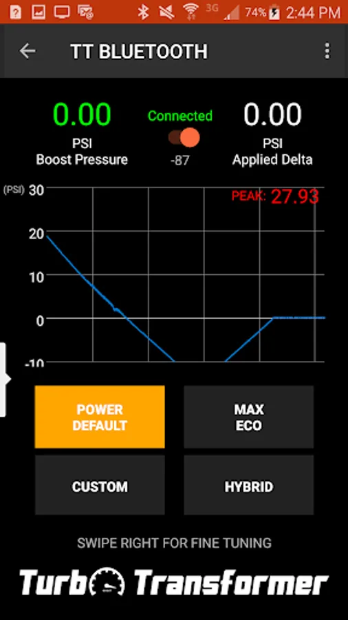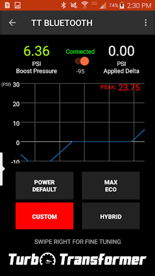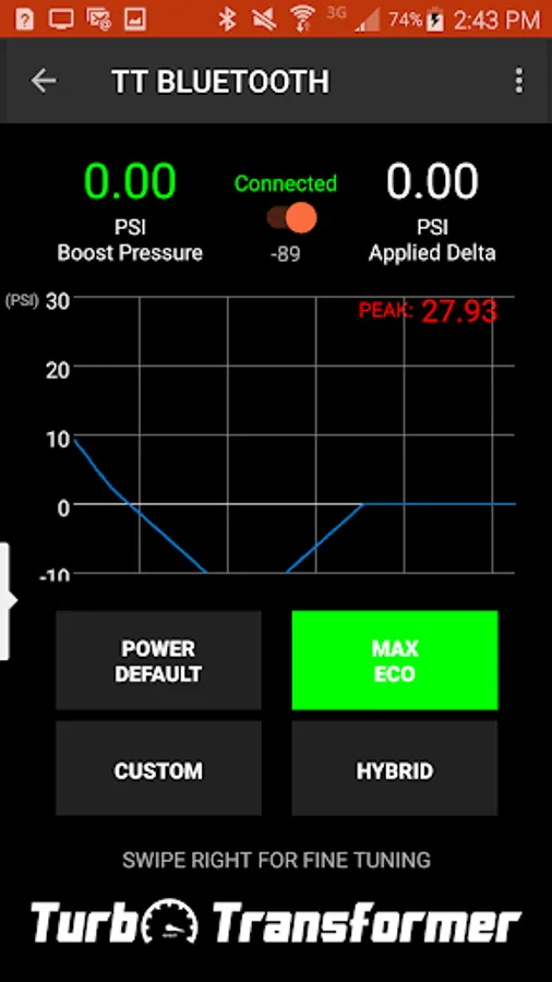 It allows the user to connect and modify the turbo in your vehicle with Turbo Transformer chips. There are multiple modes to choose from, and you can even create your own mode! You may also view the live graph of the vehicle's performance.