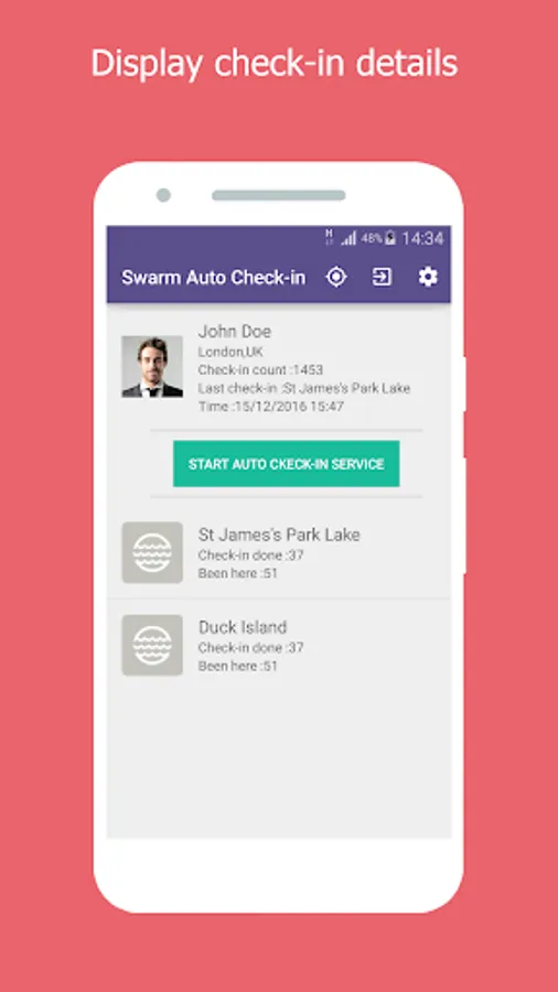 Easily login with your Foursquare account. All you need to do is to select the locations you want and start the service. Also, the location service does not need to be open. Battery is friendly :)