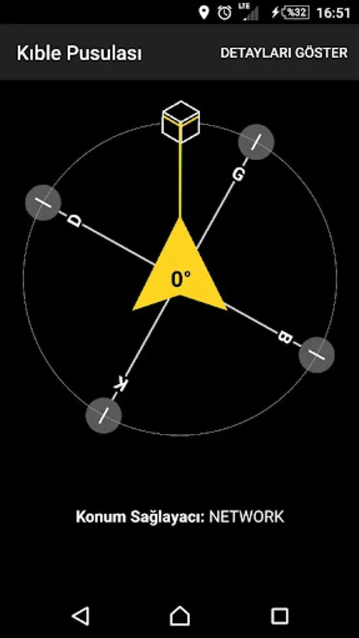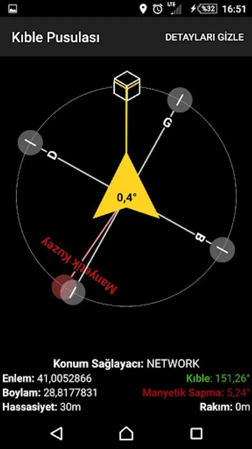 There is still the middle of the compass yellow guide line on the yellow arrow and continue. Open the middle of the Arrow is the angle you need to return to the right direction. - (Negative) values are left, + (positive) values indicate that you need to turn right. If you return to the Kaaba This extends from the center to the official line in green with yellow line on top of each other, you have found the right direction. "Show Details" button to view through enhanced display can show more information. Qibla Compass is capable of working with both GPS and NETWORK networks and the provider, which works through the calculations to automatically healthier than it is to quickly provider. Calculated based on your position in the calculations is included in the magnetic declination. So both Qibla direction and shows that both the true geographic directions.