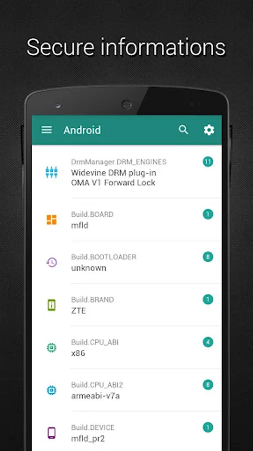 • Android - unique identifiers, build info, serial data, version numbers, processors info
