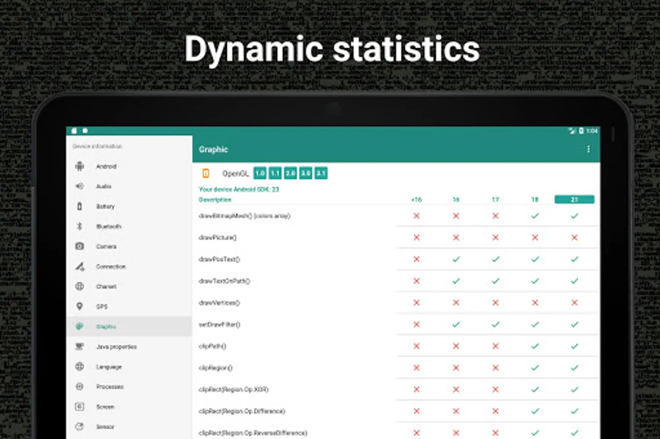 • Screen - pixel checker, brightness control, width-height, metrics info, refresh rate, rotation state, size