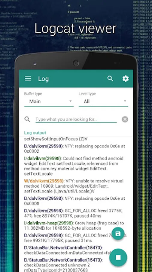 • Log - log output, search, save, main/radio/events, All/Debug/Info/Error/Verbose/Warn