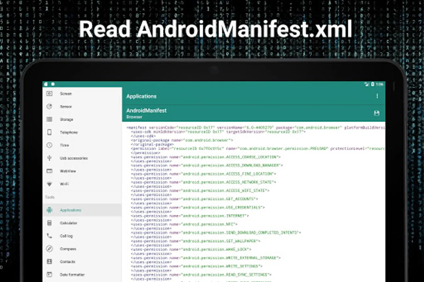 • Manifest viewer - list of apps, details, AndroidManifest.xml, extract SDK, calculate checksum...