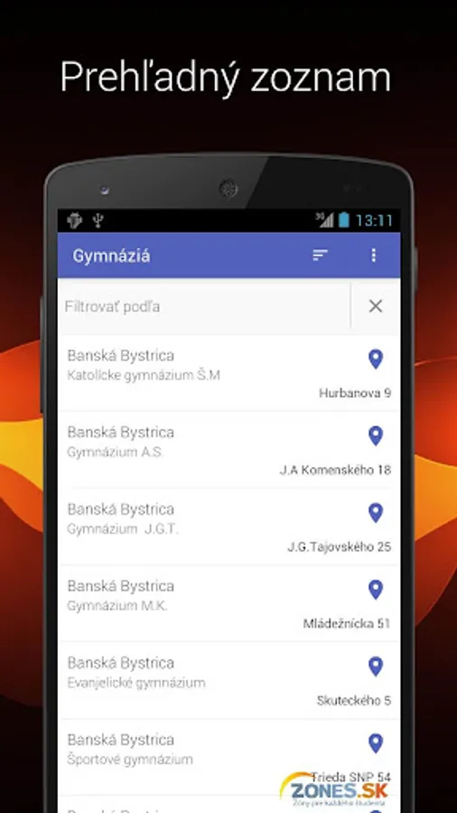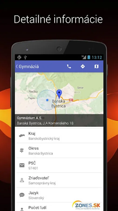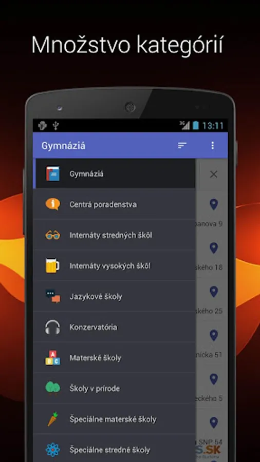 Aplikácia ponúka prehľadný zoznam všetkých vzdelávacích budov na území Slovenskej republiky. Nájdete v nej základné, stredné a vysoké školy, ubytovne, jedálne a ďalších, spolu 12 tisíc objektov. Všetky obsahujú základné informácie, ako sú poloha, kontaktné informácie či počet ľudí, ktorí ich navštevujú.