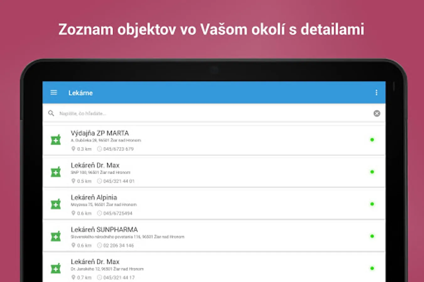 & # 8226; & # 8195; Pharmacies, standby., Optics, ADOS - location, contact details and opening hours (some pharmacies) on healthcare facilities in Slovakia
