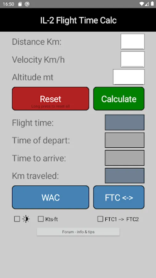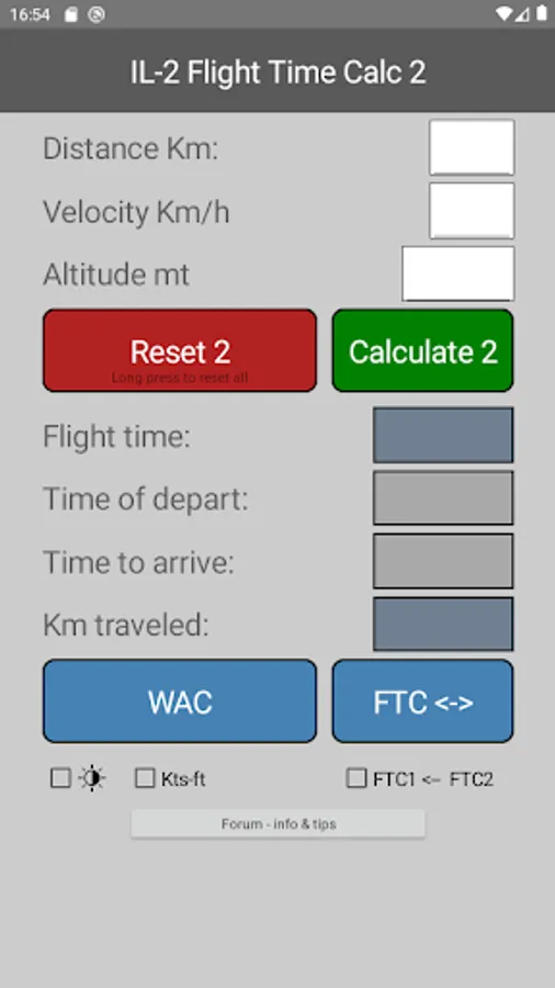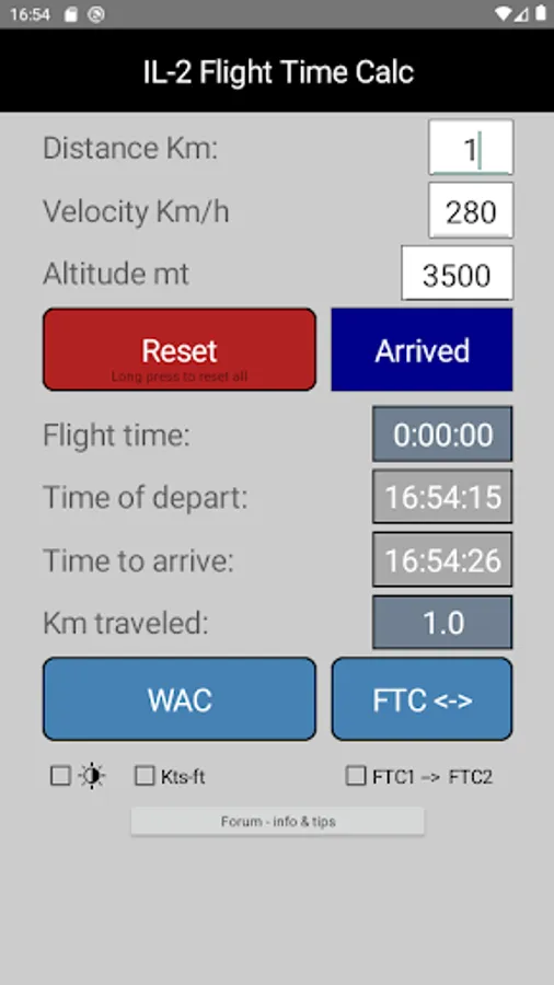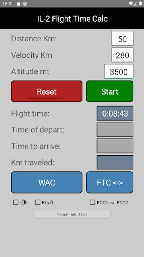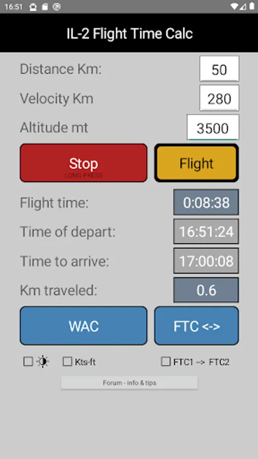 By entering Distance, IAS and Altitude, it returns the flight time, then pressing Start starts the real-time calculation of the remaining time and distance traveled.