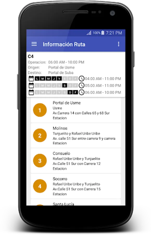 * Information about the selected bus (Number of stops and traffic schedules from Monday to Sunday and holidays).