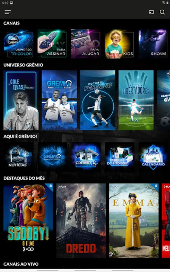 On the Grêmio Play platform, Grêmio fans will find: backstage of the games, best bids, goals of the season, webseries, interviews with players and the technical team, all content about the tricolor gaucho. In addition, Grêmio Play brings you the best Hollywood content: Blockbusters from world cinema, established series, kids content, concerts by the biggest names in world and national music, all in the palm of your hand. A special platform for grêmistada to be always connected with the gaucho tricolor.