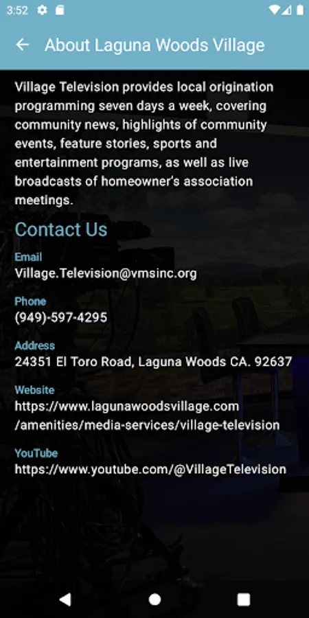 Village Television serves the community of Laguna Woods Village in California.Since 1967, it has been the station's mission to create a greater sense of belonging that leads to an informed and involved community. Through the platform that we provide, local origination programming, residents and organizations connect with one another through the programming that Village Television offers, and in turn feel a greater sense of belonging to the community in which they live. Village Television provides local origination programming seven days a week, covering community news, highlights of community events, feature stories, entertainment programs, as well as; live broadcasts of the communities homeowner’s association meetings.
