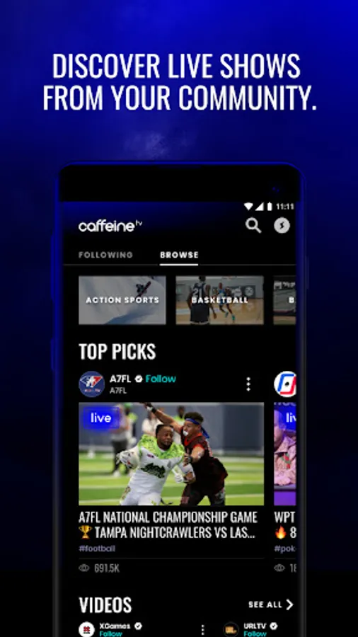 Caffeine is the home for live sports + community, from Action Sports to Basketball, Battle Rap, Dance, and more. Download Caffeine and join over 30 million monthly active users discovering, watching, and interacting with sports and fans.