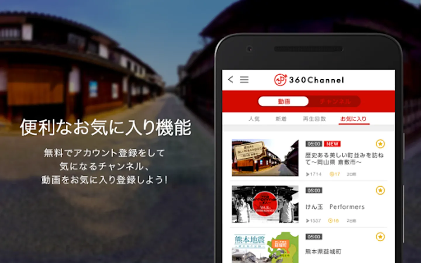 ・すきま時間にスマートフォンで動画をお気に入りボタンでストックして頂き、VRアプリで、ストックした動画をゆっくり楽しんでいただけます。もちろん、スマートフォンやパソコンでも再生可能です。(360Channelとしては、HMDを装着した上で視聴していただくことを推奨しております)