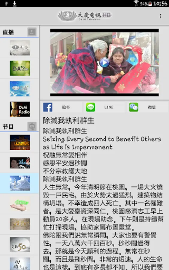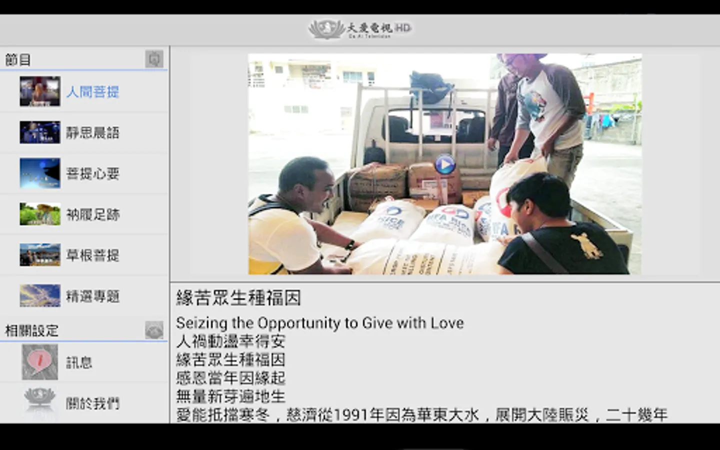 Da Ai TV broadcasts moving stories of love and goodness to rekindle the compassion and kindness in people's heart, provoke caring actions and reach out to others. We want to change the world through media and provide clean wholesome contents that would uplift and inspire people. In Buddhism, we believe that every person's original nature is pure and good.