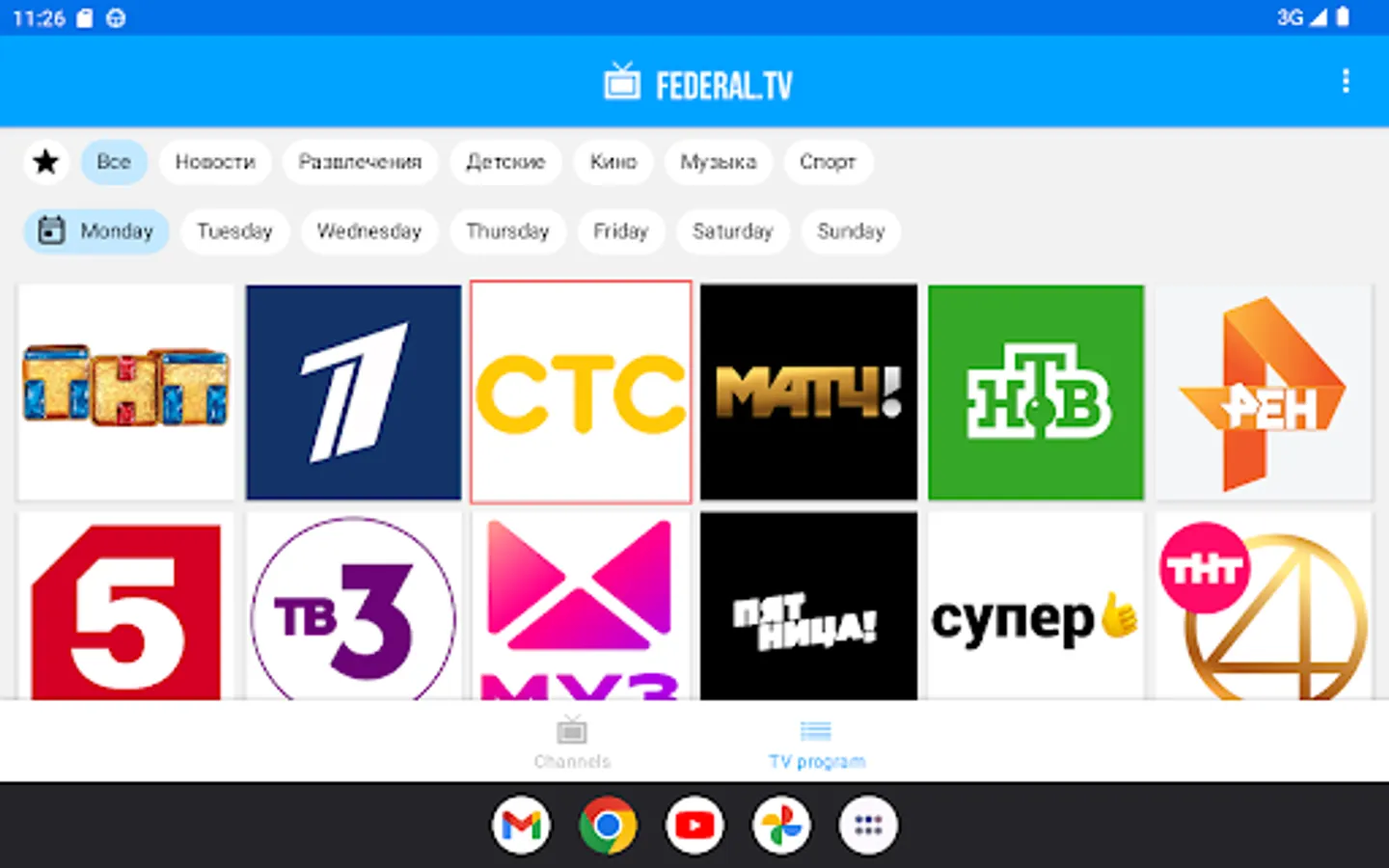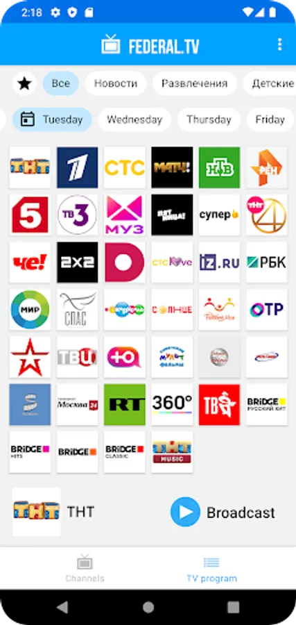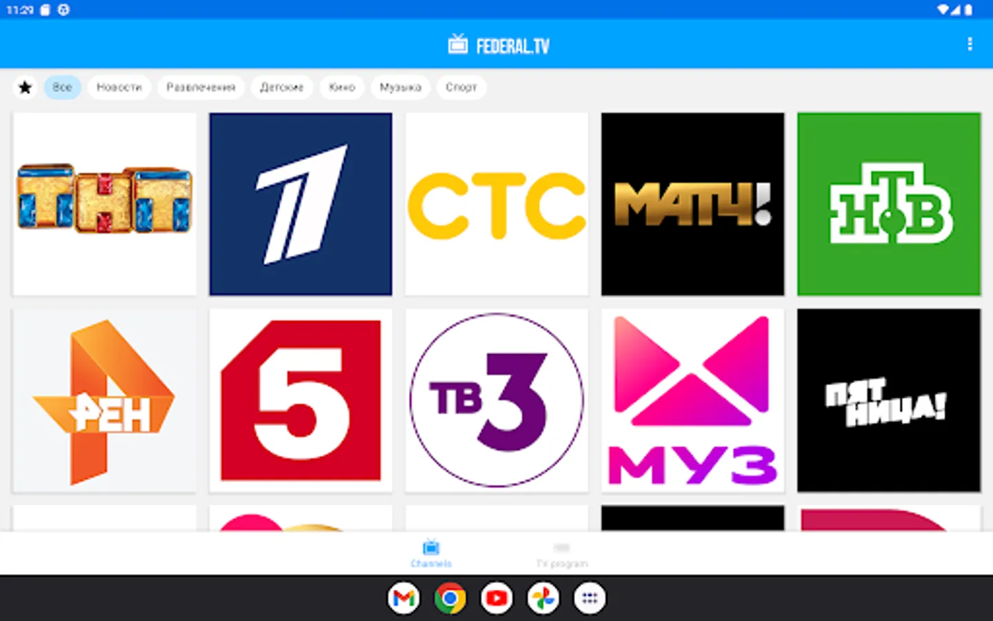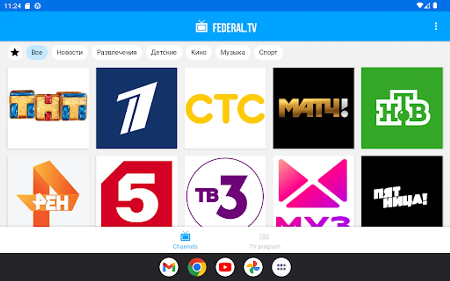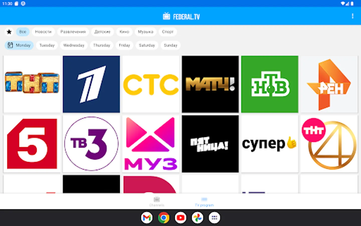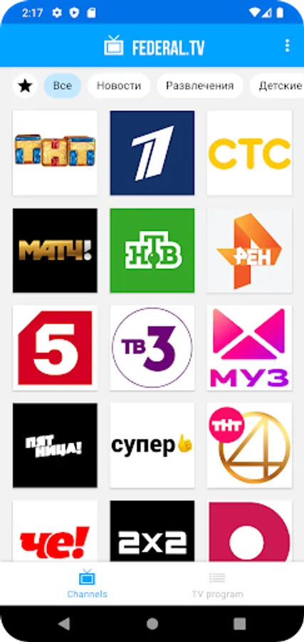 Free online TV in which you will find more than 40 popular live TV channels: First, TNT, STS, MATCH TV, NTV, Ren TV, Channel Five, Zvezda, TV-3, Muz TV, Friday, Bridge TV and others. Also, the Premier Match, Football Match, Fighter and others are available by subscription.