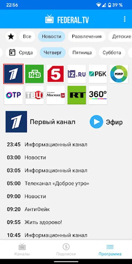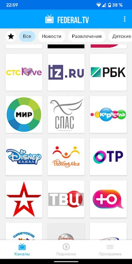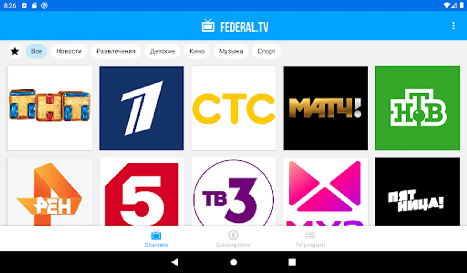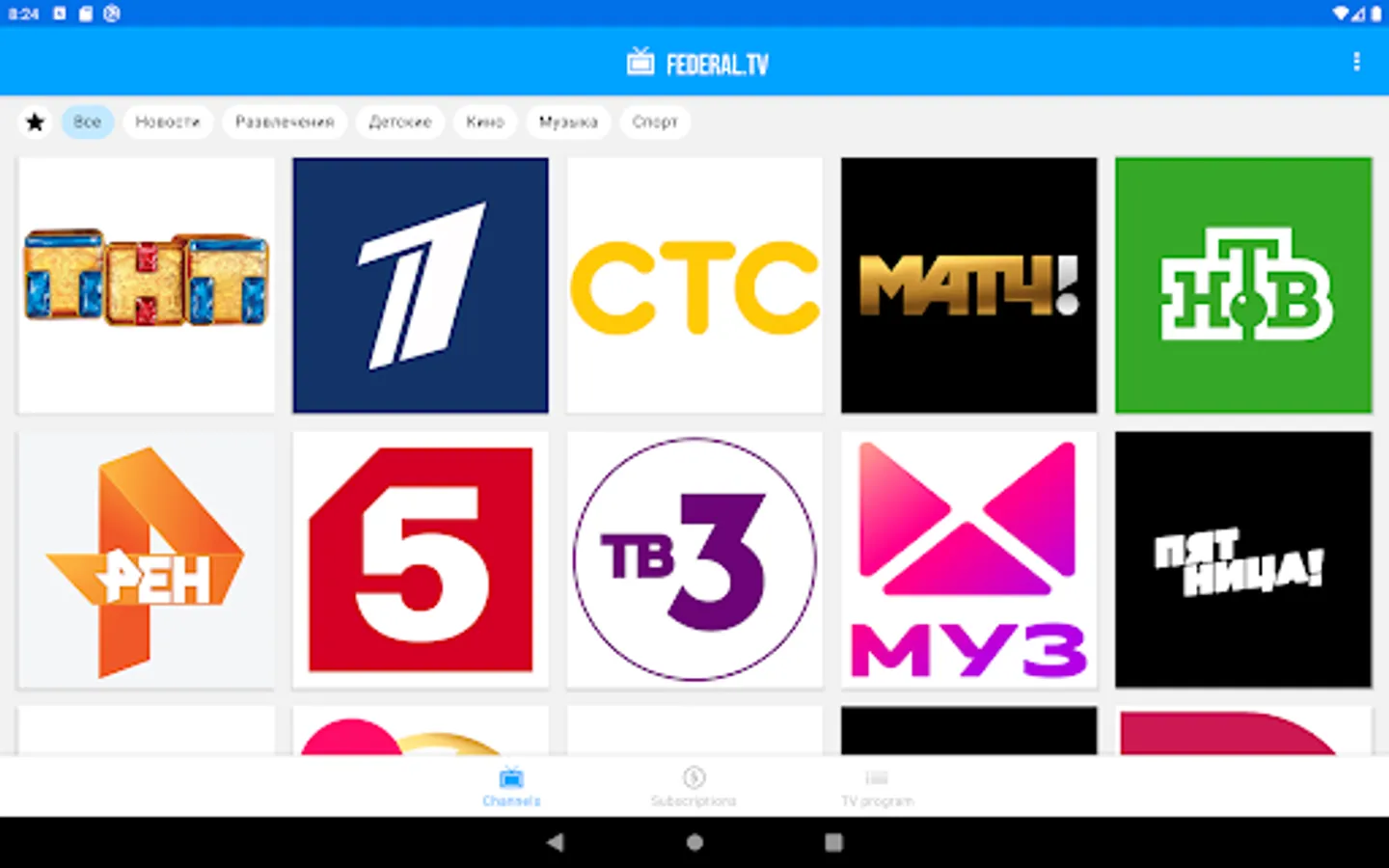 Free online TV in which you will find more than 40 popular live TV channels: First, TNT, STS, MATCH TV, NTV, Ren TV, Channel Five, Zvezda, TV-3, Muz TV, Friday, Bridge TV and others. Also, the Premier Match, Football Match, Fighter and others are available by subscription.