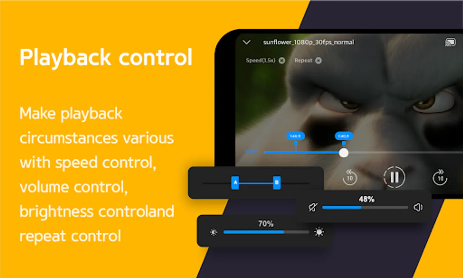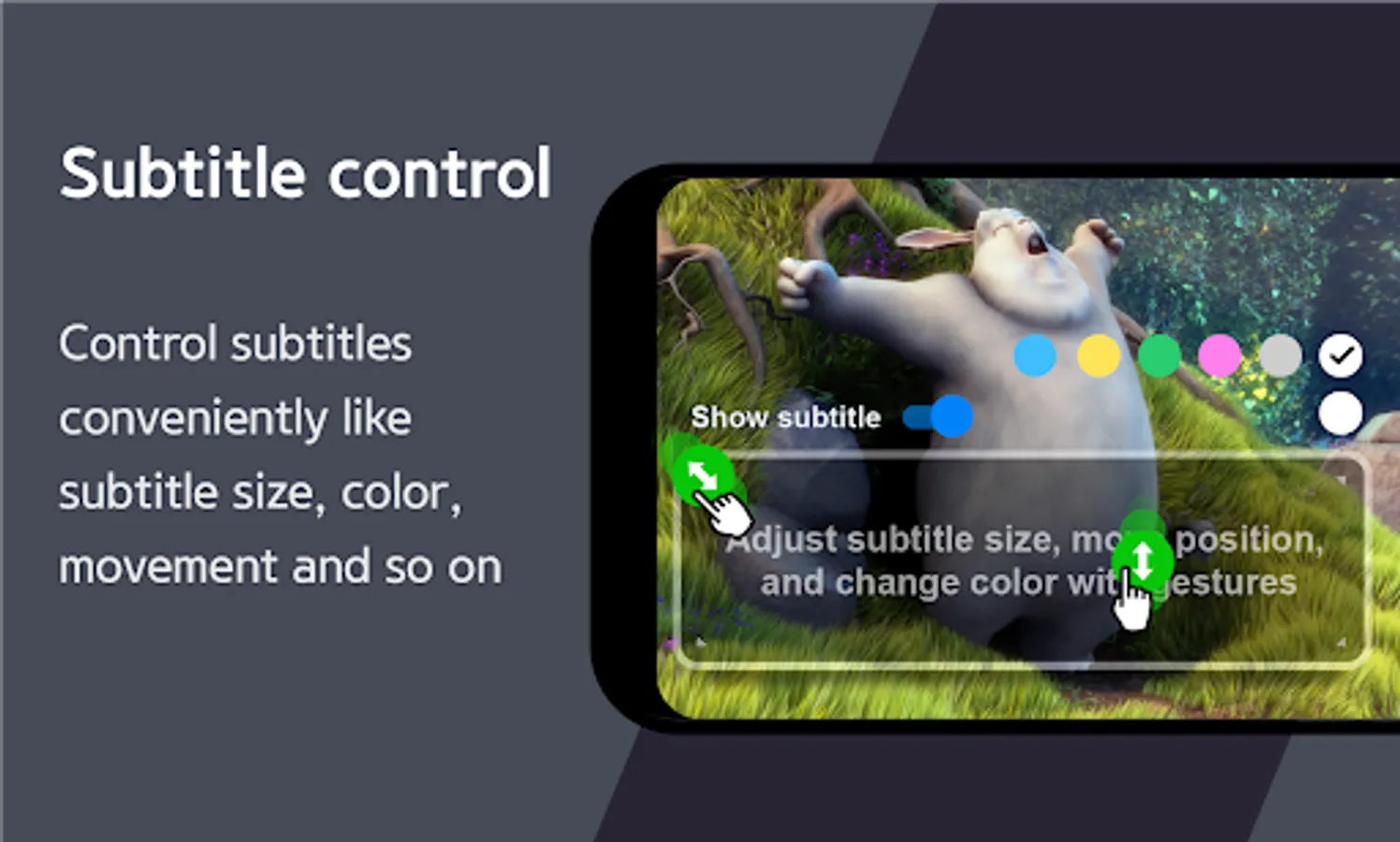 □ Easy subtitle control: During playback, you can long touch or use quick access to adjust subtitle text color, position, size or turn it on/off.