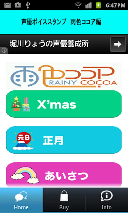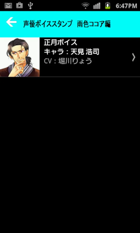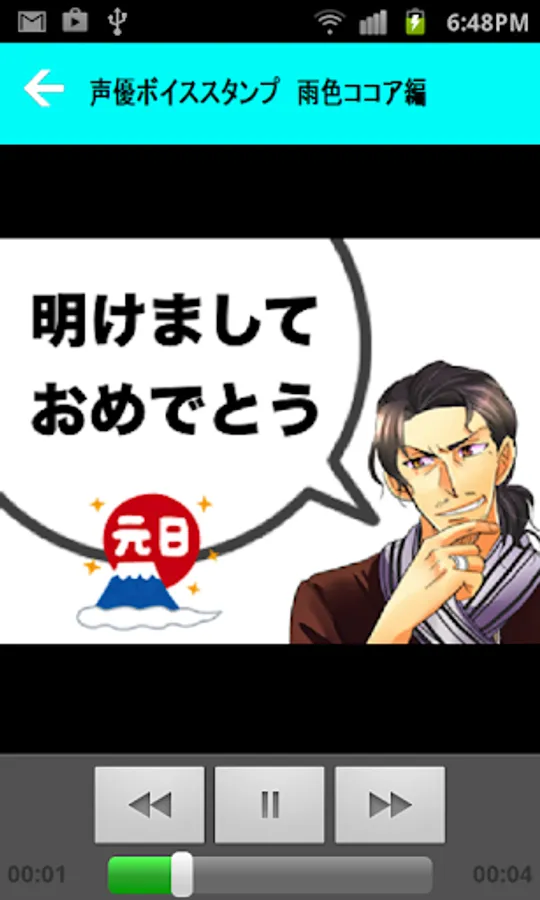 声優ボイスを再生したり、保存してLINEその他のメッセージアプリで送ることができます。