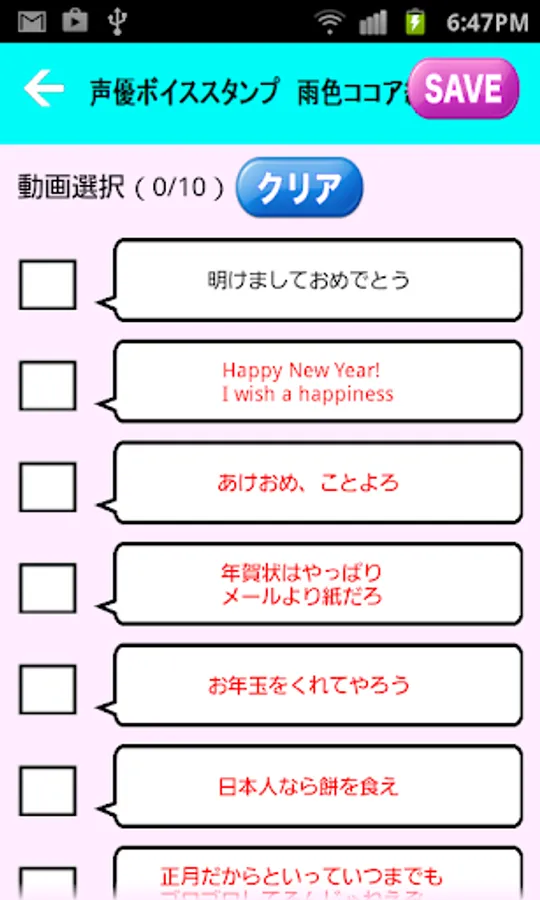 お好きな声優音声をチェックボックスで選択し、画面右上の「SAVE」ボタンタップでギャラリー(SDカード)に自動保存できます