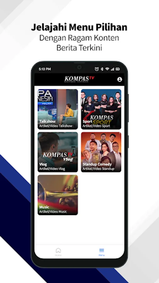 Dirancang dengan dukungan teknologi Android terkini, menyaksikan liputan live streaming dan menonton video berita menjadi lebih mudah, menyenangkan, dimana saja setiap detiknya. Aplikasi berita Kompas TV terbagi dalam :