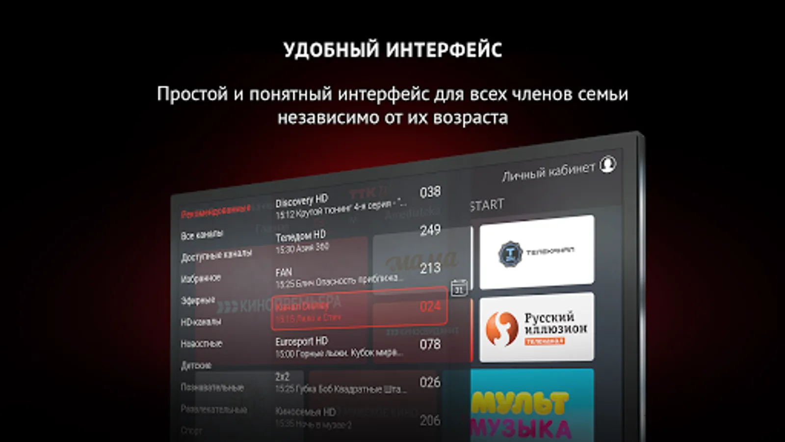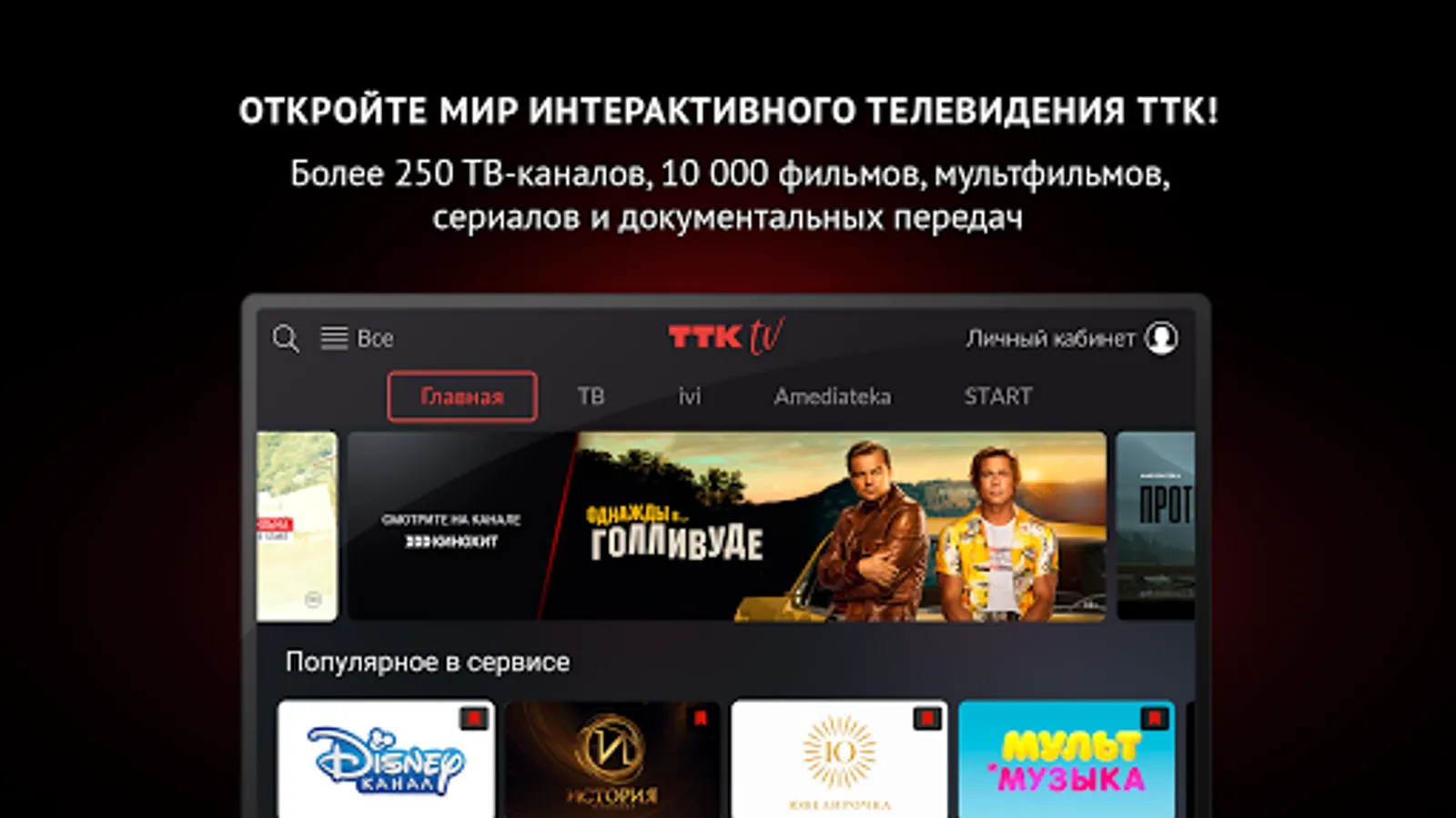 Mobile application "TTK TV" is an opportunity to watch your favorite TV programs, films and series on mobile devices based on Android OS, as well as to use the Multiscreen service, to use the pause and rewind functions of the live broadcast.