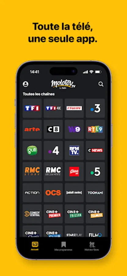 Easily watch all French television in streaming with Molotov. Browse through many programs: news and information, French and US TV series, films, sports, documentaries, reality TV, children's programs, entertainment...