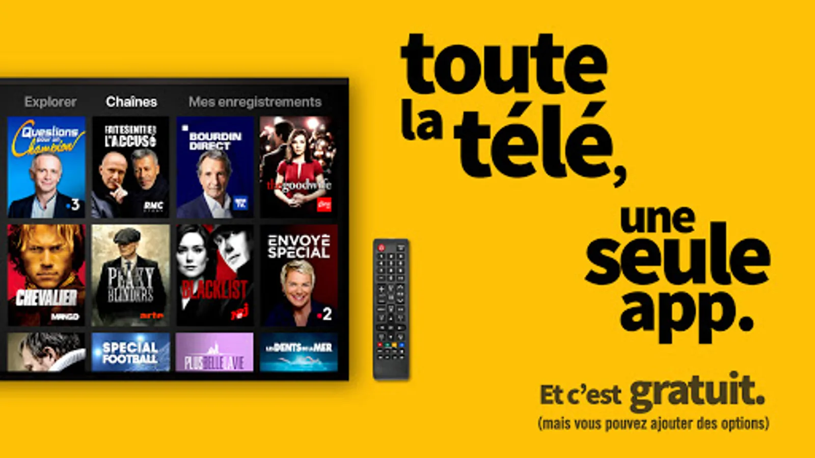 TF1 (Star Academy, Here it all begins, Tomorrow belongs to us, Téléfoot, Football - 2022 World Cup: the mag, the Late with Alain Chabat, opening ceremony of the 2022 World Cup in Qatar, football match Qatar - Ecuador , France Australia match, France - Denmark football match, France Tunisia football match), France 2 (Such a great sun, We are not in bed), France 3 (More beautiful life, Murdoch's investigations, All the sport), France 5 (C dans l'air, C à vous, La maison France 5, Echappées Belles), M6 (Bull, Kaamelott, Top Chef, Love is in the meadow, Pekin Express, Capital, Forbidden Zone, Exclusive investigation, Household scenes, NCIS, The best pastry chef), Arte, C8 (Do not touch my post, TPMP), W9 (The Marseillais, An almost perfect dinner, The Fifties), LCP-Public Sénat, France 4 (Taratata ), BFM TV (Le live BFM, BFM Story, Le 20H, Le journal du mondial, BFM Foot), CNews, CSTAR (Top clip, Top streaming, Top album), Gulli, France O, L'Equipe (Football, L Mercato team, L'Equipe du soir, L'Equipe Foot), 6Ter (Marvel), Number 23, RMC Découverte, FranceInfo, the INA channel, TV5 Monde, France 24 (Le journal du mondial), BFM Business , EuroNews, Cheddar, LCP 100%, Public Sénat, Fashion TV (Fashion Week), Luxe TV, Luxe TV 4K, Winamax TV.