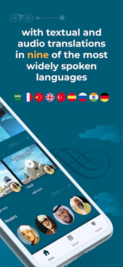 Live broadcast of Quran recitations with textual and audio translations in seven of the most widely spoken languages worldwide: English, Spanish, Russian, Hindi, German, French, and Chinese.