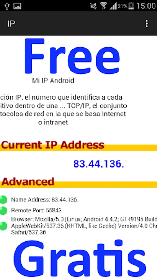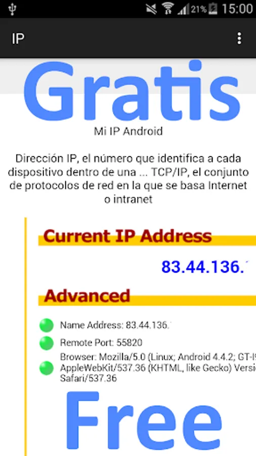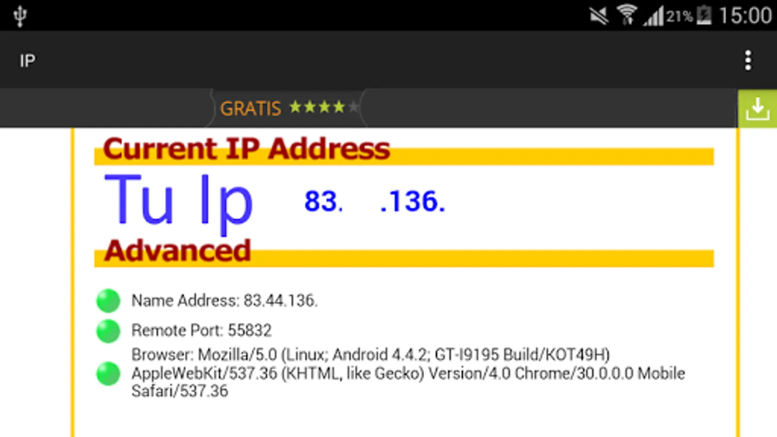 Free application to find out, find and watch what your real IP address, in Spanish Language detailed information about the provider you are using. public that is visible on the Internet with just the App open and safely, since the data are not saved. Closing program is deleted, so you will not know the geographic location connected to him or browser information or Android Operating system ..