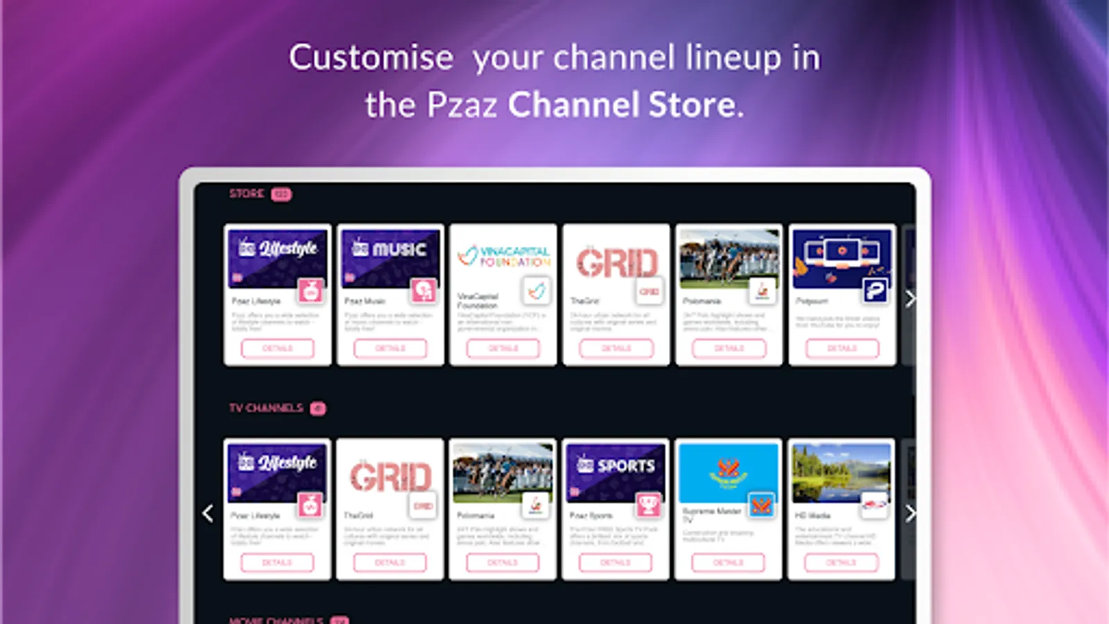 Discover binge-worthy TV - films, shows, series, sports and more - in the Pzaz Channel Store, add them to your channel lineup and indulge in great TV, on anything, anywhere, anytime.