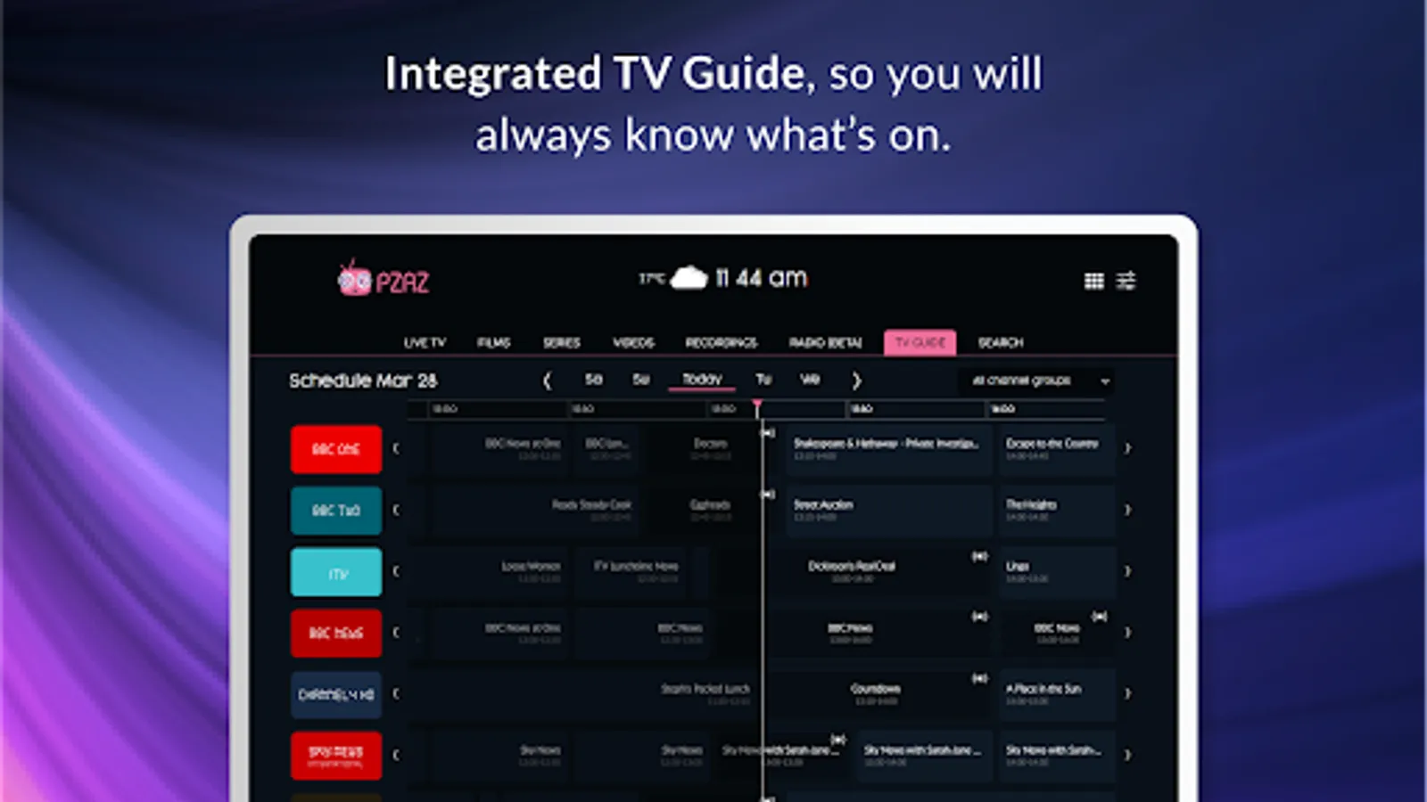 Pzaz provides the perfect mix of free and paid TV channels, video on demand, a free TV guide, and all your free and paid subscriptions in one app, accessible on any device.