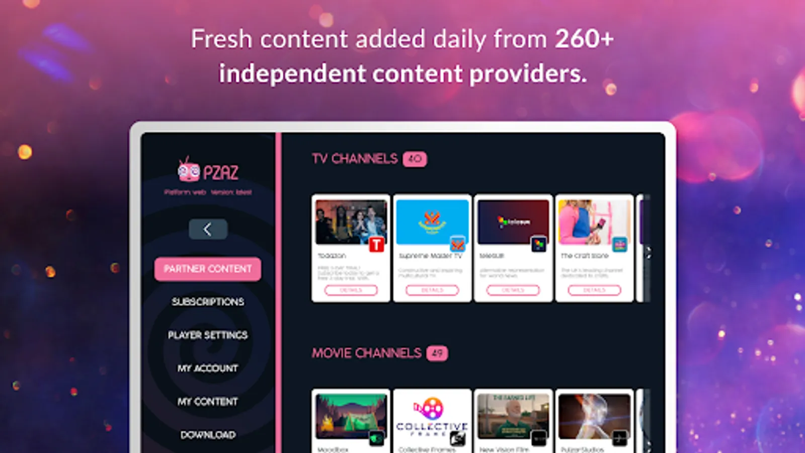 Pzaz compliments your existing video subscriptions like Amazon Prime, AppleTV or Netflix. With a vast collection of independent channels and content providers at your fingertips, Pzaz is establishing itself as one of the world’s largest multi-language TV platforms.