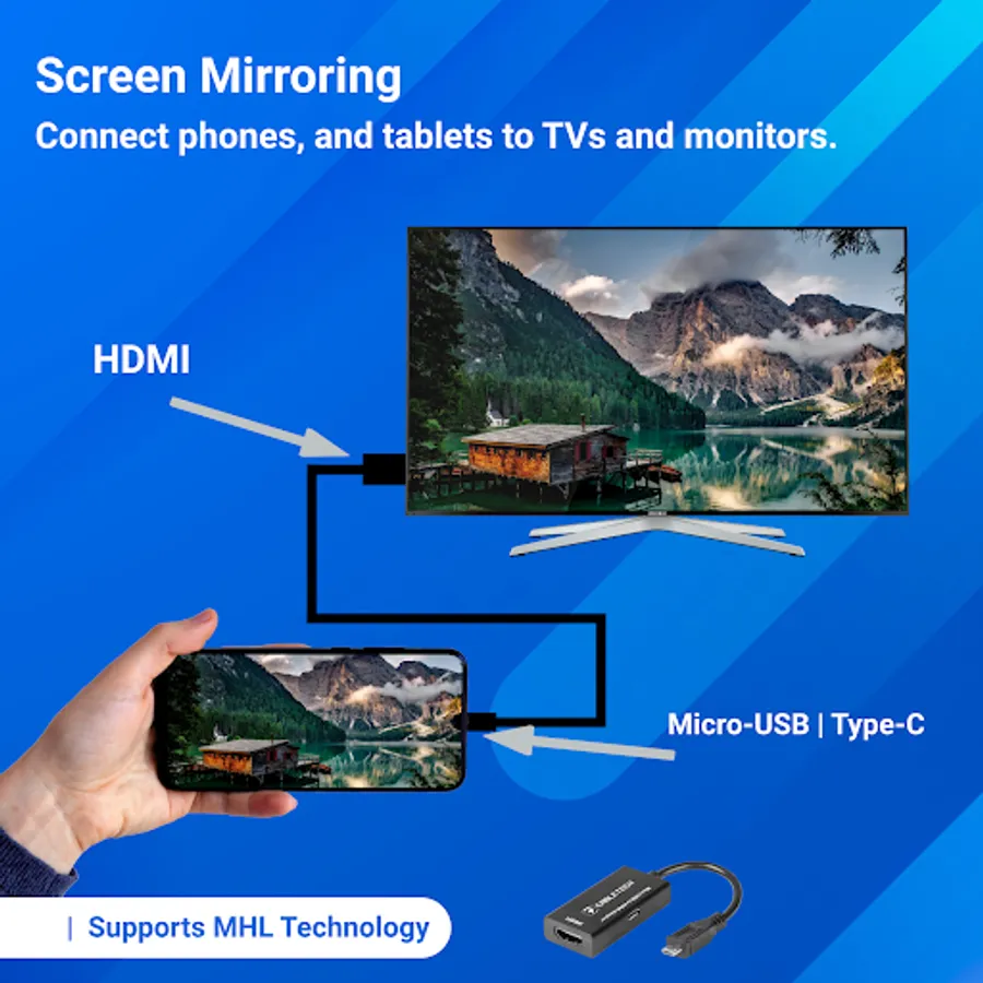 Screen mirroring with tv mobile screen to tv is a powerful app that allows HDMI MHL from phone to tv to mirror your Android smartphone on the TV screen. You can easily access all of your games, photos, videos, and other applications on a big screen using HDMI from phone to tv cable just like a dual-screen to smart devices such Smart TVs all thanks to phone to tv screen app no wifi.