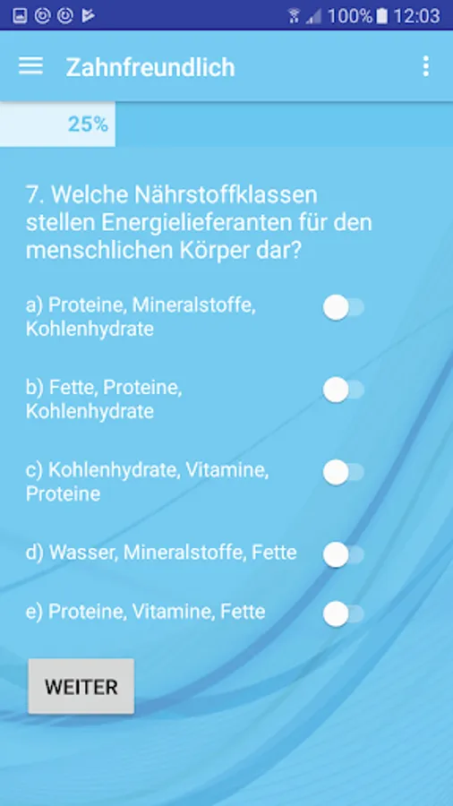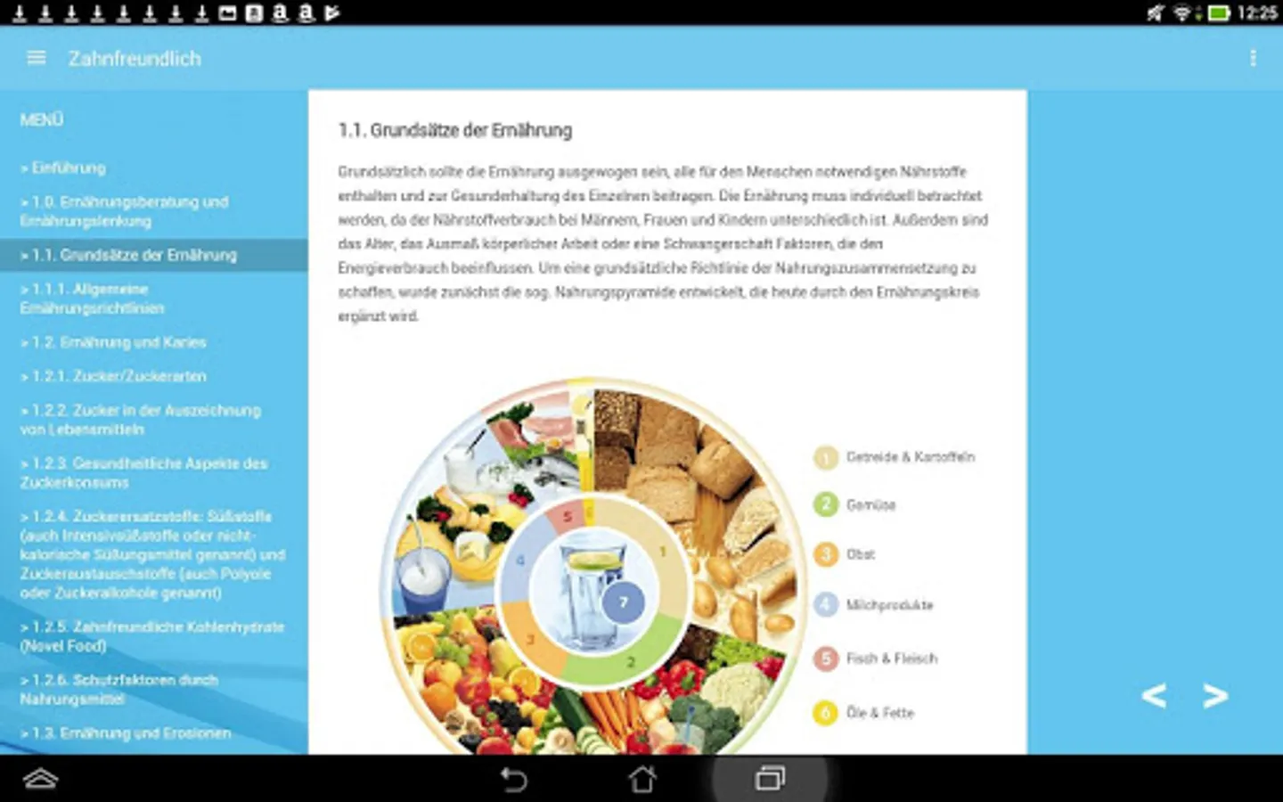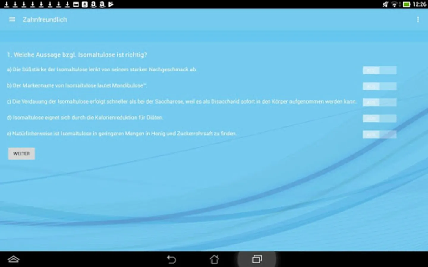 In compact modules, the tooth-friendly app teaches the principles of the diet, illuminated u. a. Sugar and sugars, food labeling and the tooth-friendly test methods, erosions, vitamins, probiotics and the importance of saliva. Spontaneously, the own knowledge to can be reviewed based on 26 questions and knowledge gaps with the contents of tooth-friendly app will be closed.