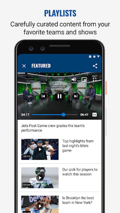Catch highlights and live action from your favorite New York sports teams: New York Mets, New York Yankees, New York Jets, New York Giants, New York Knicks, Brooklyn Nets, New York Rangers, New York Islanders, New Jersey Devils and Uconn Women's Basketball.