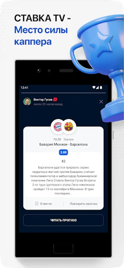 Get hundreds of free predictions for the outcome of matches, competitions and fights from the best sports forecasters every day - right on your mobile device. Don't rush to open the betting app, because now we have everything you need! Visit our feed and find out what Gusev or Elagin think about the upcoming competitions - an expert opinion on which you can build your predictions and confidently place bets on sports. Trust professionals, evaluate analytics and become a successful capper right now!