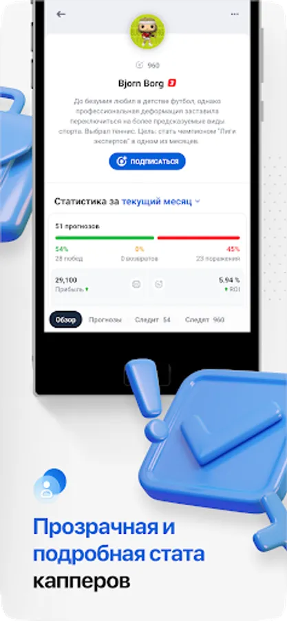 Free forecasts in the application are provided by real experts. A special section reflects the rating of bookmakers, which includes such companies as Winline, Pari, Fonbet, Melbet, Betbum, Leon, Liga Stavok and others. Evaluate and choose the best forecasters, read the analytics of football, hockey and other sports, and do not forget to comment on how much their exclusive advice helped you. Well, if you have any complaints about them, also write so that transparent statistics and ratings of cappers are the most honest.