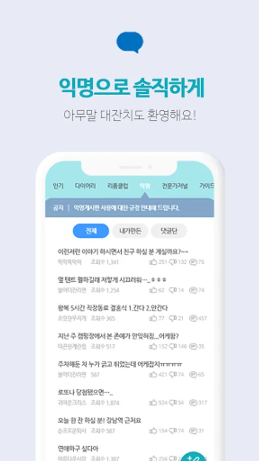 때론 익명이 편할 때가 있죠. 솔직한 모습 그대로 자유롭게 소통해보세요.