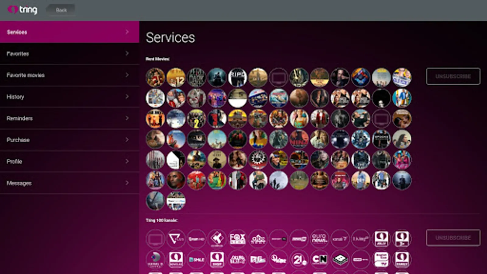 • Paketa VOD (video on demand), një videotekë gjigante me mijëra tituj, e gjitha për t’u zbuluar. Filma e fundit, realizimet ikonike kinematografike të të gjitha kohërave, serialet më të suksesshme botërore, dokumentarë, programe për fëmijë, prodhime origjinale Tring, reality show, koncerte, sitcom-e, dhe shumëçka tjetër.