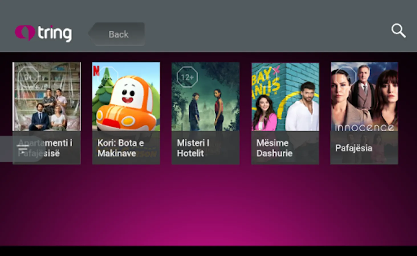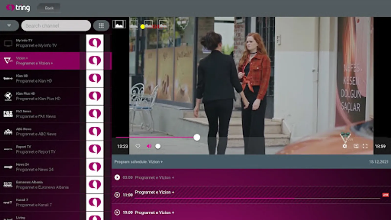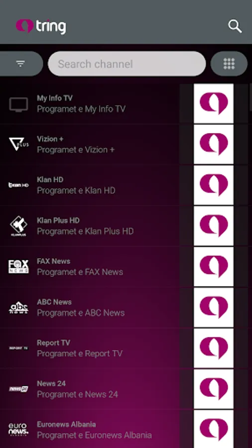 Tring Tv, një klikim dhe përpara ju shfaqet e ardhmja. Aplikacioni i gjeneratës së re që eksperiencën televizive e sjell në dimensionin më novator. Tashmë nuk keni pse mundoheni për të mos humbur programet e preferuara, pasi ato do t’i keni në dorën tuaj në çdo vend dhe në çdo kohë.