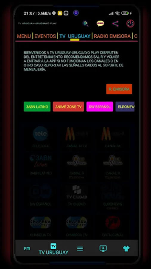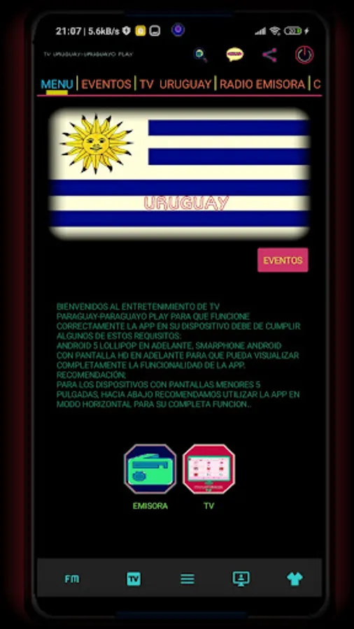 Welcome to TV URUGUAY-URUGUAYO PRO enjoy training, your favorite channels on your Android smartphone, Tablet and TV Box. We have varieties of open signal Uruguayan Channels. You can also tune in to the radio station.