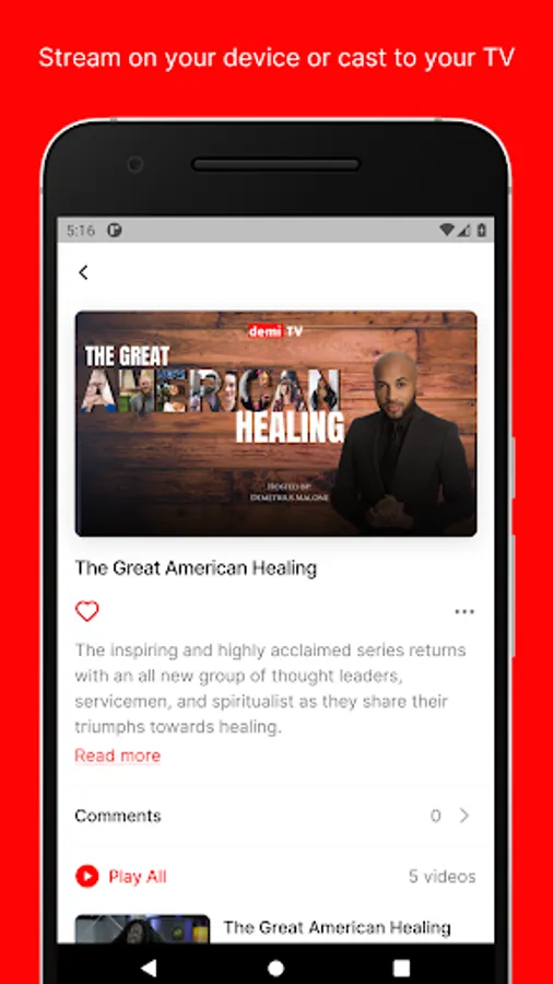DemiTv is a premium on-demand streaming app that combines electrifying originals, mind blowing content from some of the hottest independent production companies, and nationally syndicated content- guaranteed to give viewers an entertaining experience like none other.