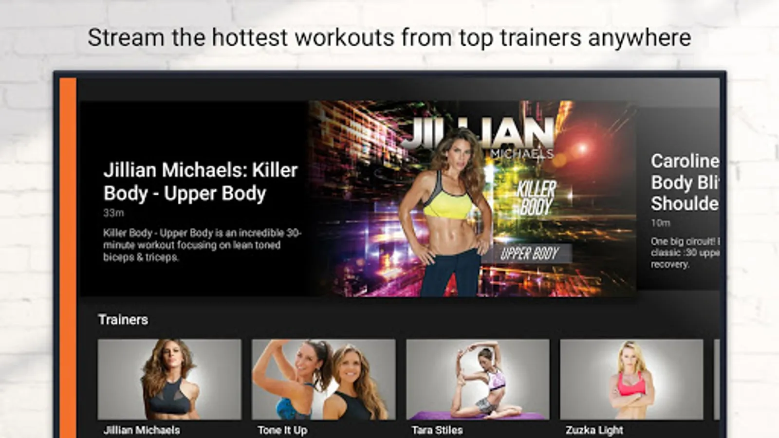 No matter what your fitness goals, FITFUSION by Jillian Michaels has you covered. Whether you want to lose weight, train for a marathon or live a healthy life, FITFUSION by Jillian Michaels is a virtual one-stop-shop for on-demand streaming premium workouts from the worlds most renowned trainers, and healthy lifestyle video documentaries. Whether you want to do bootcamp with Jillian Michaels, HIIT training with Zuzka Light, Yoga with Tara Stiles, Pilates with Cassey Ho, tone up with the Tone It Up Girls, walk it off with Leslie Sansone, or dance off with Fade2Fit with Teyana Taylor – FITFUSION by Jillian Michaels has all your favorite modalities! Yoga, bootcamp, Pilates, dance, barre, weight lifting, calisthenics, HIIT, kickboxing, indoor cycling, pre & postnatal and . If you want it we got it for you from the best of the best!