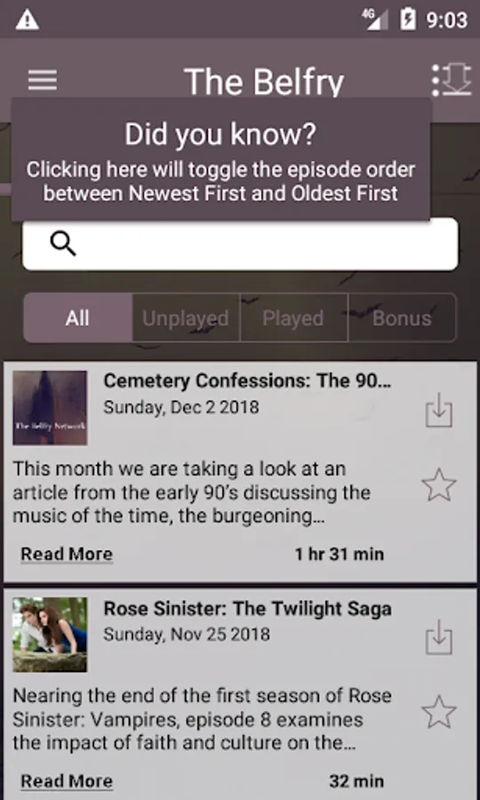This is the most convenient way to access The Belfry Network on your phone. With this app you are always connected to the latest episodes and the show. You can also star your favorite episodes and save them to a list so you can easily enjoy them over and over! This app is complete access to every podcast on The Belfry Network, and if you're a fan of the shows you won't want to be without it!