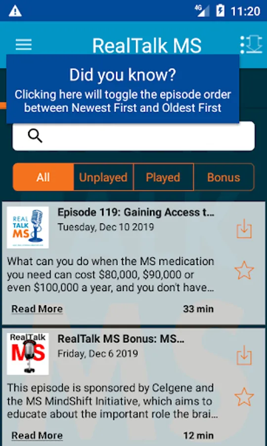 This is the most convenient way to listen to the RealTalk MS podcast (produced in partnership with the National MS Society) on your phone or tablet. With this app, you are always connected to the latest episodes. You can also save your favorite episodes to listen to them again. And you'll automatically receive bonus content every time Jon makes it available. This app is complete access to RealTalk MS and if you're a RealTalker, you won't want to be without it!