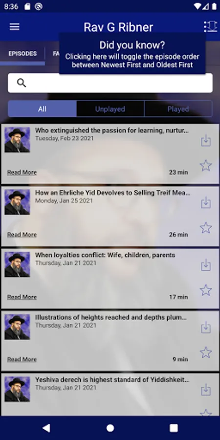 This is the most convenient way to access Rav Gershon Ribner on your phone. With this app you are always connected to the latest shiurim and the show. You can also star your favorite episodes and save them to a list so you can easily enjoy them over and over! This app is complete access to Rav Gershon Ribner and if you're a fan of the show you won't want to be without it!