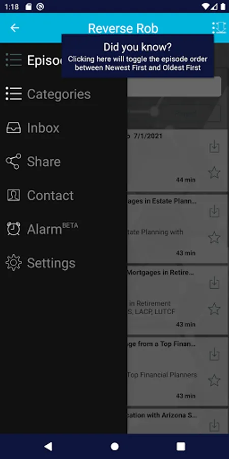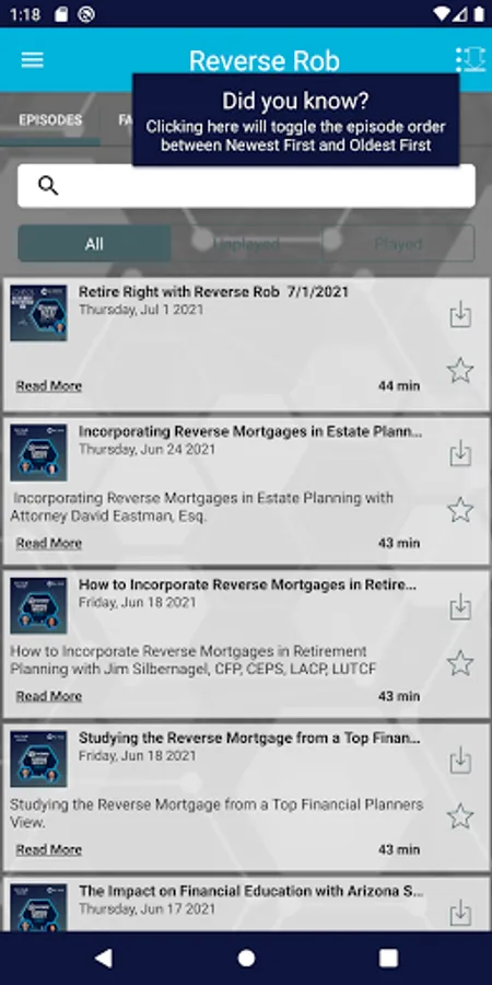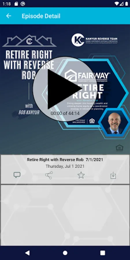 With this app, you are always connected to the latest episodes and the show. Quickly star episodes and save them to a list so you can easily enjoy them over and over! This app has a Car mode too! Rotate your phone to display larger playback controls. It is the best and most convenient way to access Retire Right with Reverse Rob.