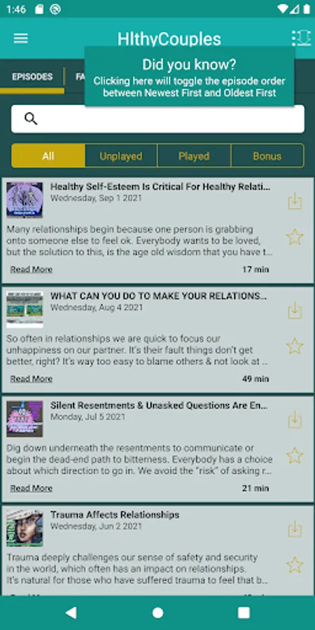 This is the most convenient way to access What Healthy Couples Know on your phone. With this app you are always connected to the latest episodes and the show. You can also star your favorite episodes and save them to a list so you can easily enjoy them over and over! This app is complete access to What Healthy Couples Know and if you're a fan of the show you won't want to be without it!
