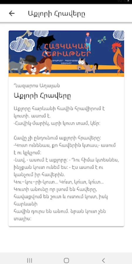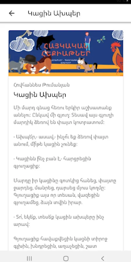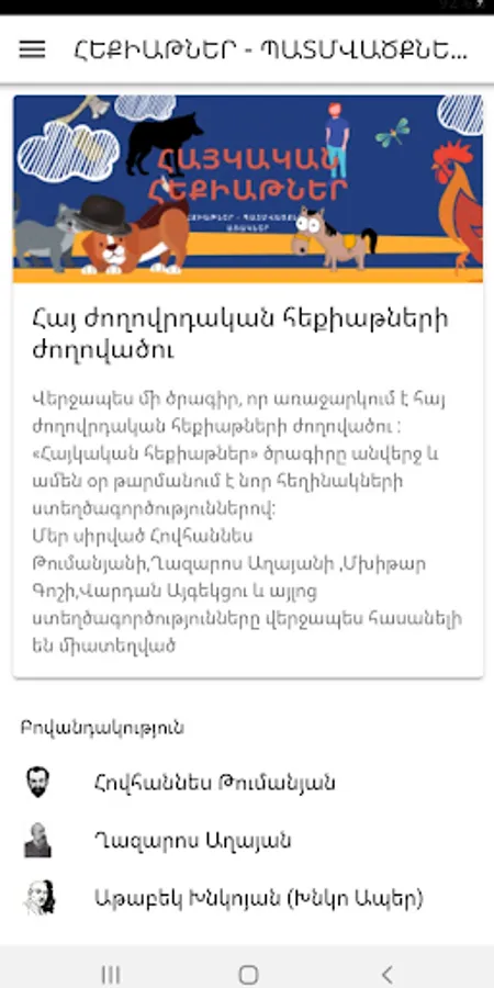 Finally, a program that offers a collection of Armenian folk tales.The "Armenian fairy tales" project endlessly and everyday with new creations.The works of our favorite Hovhannes Tumanyan, Ghazaros Aghayan, Mkhitar Gosh, Vardan Aygektsi and others are finally available all together